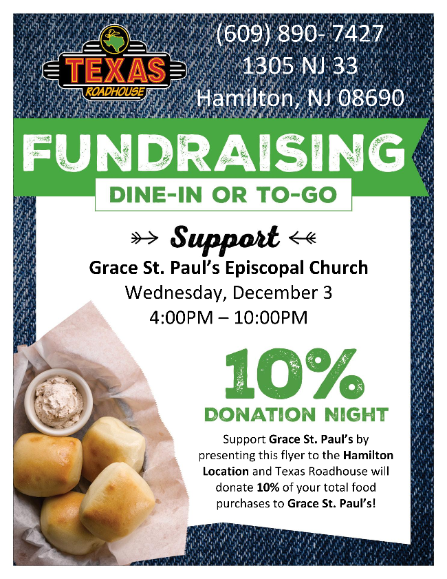 Dine in or take out at the Hamilton Texas Roadhouse from 4:00-10:00pm to support Grace-St. Paul’s on Wednesday, December 3rd. All proceeds will assist the Nehemiah Committee’s future projects.