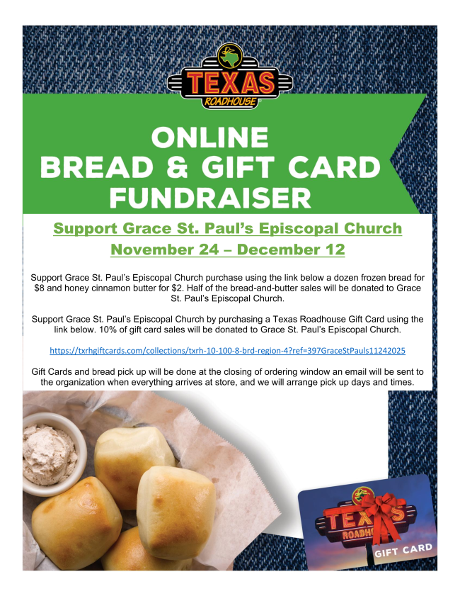 If you are unable to attend this fundraiser on December 3rd, you’re in luck! You can also support Grace-St. Paul’s by participating in the Texas Roadhouse “Bread & Butter” and Gift Card sales. The deadline for these sales is Friday, December 12th. Please see the flyer below for more information.