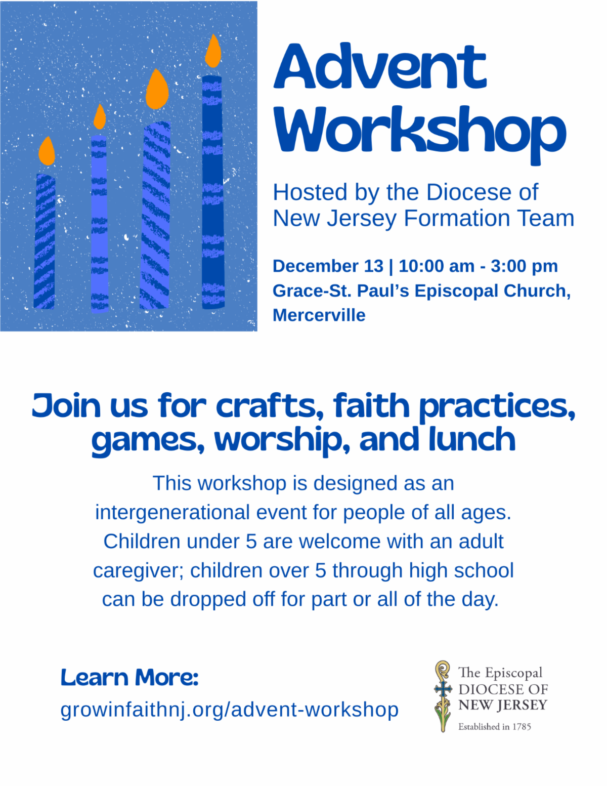 The Diocese of New Jersey Formation Team invites you to join them for crafts, faith practices, games, worship, and lunch. Resources for this event are featured on their Advent resources page if you want to learn more!